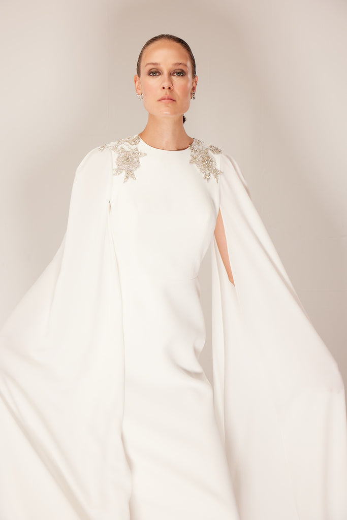 • A dress with majestic, cape-like sleeves and elegant shoulder embellishments