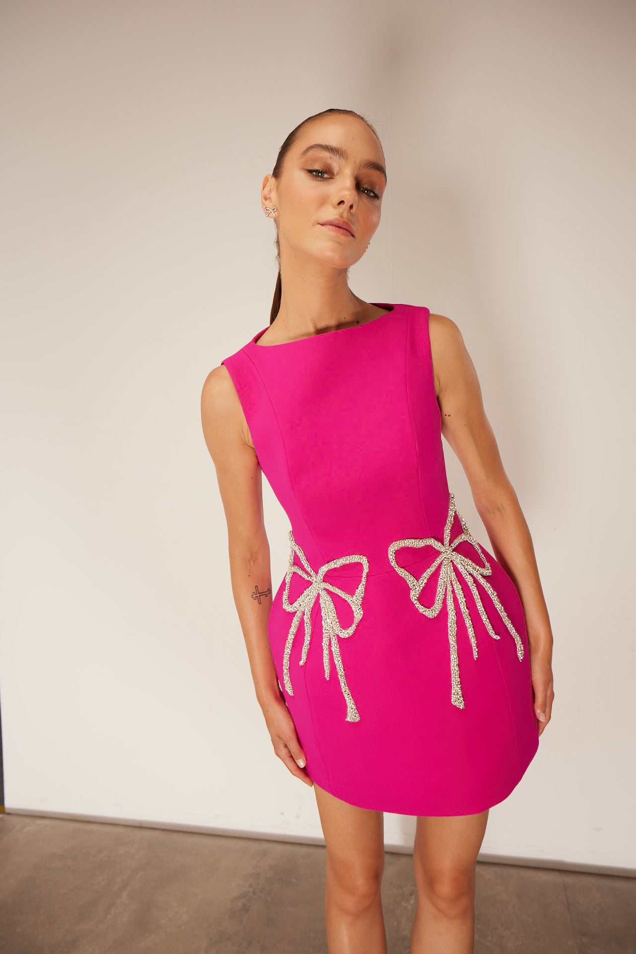 • A mini dress embellished with bow and stone embroidery
